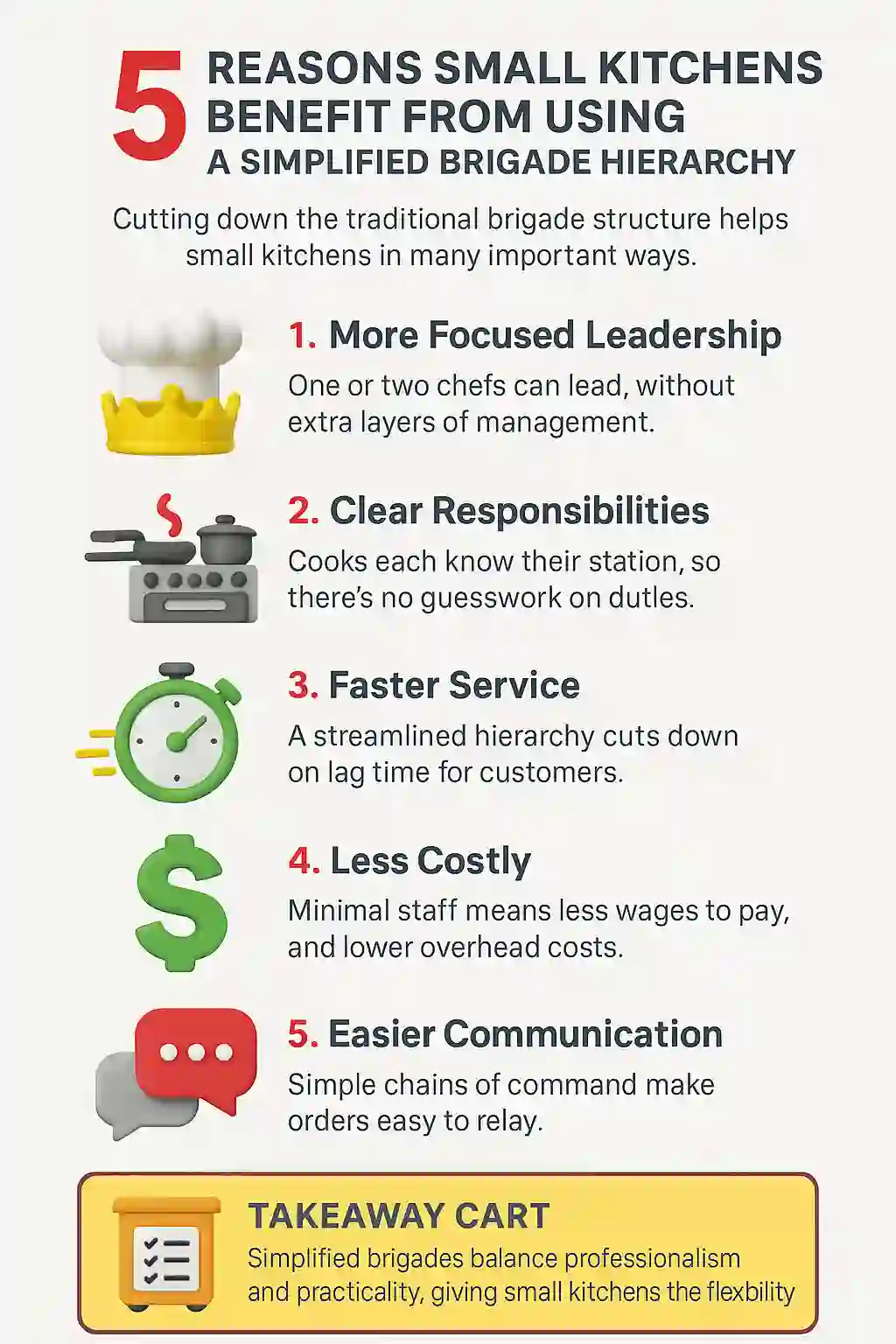 Small kitchens often operate inches apart, which means one miscommunicated ticket can derail the entire line. A simplified brigade ensures every cook knows their responsibilities and who they report to, cutting down errors dramatically.
